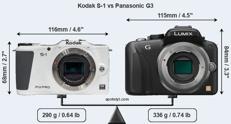 Die physische Größe und das Gewicht der Kodak S-1 und der Panasonic G3 werden in der nachfolgenden Graphik illustriert. Die beiden Kameras werden entsprechend ihrer relativen Größe dargestellt. Alle Größenangaben sind auf den nächsten Millimeter gerundet.