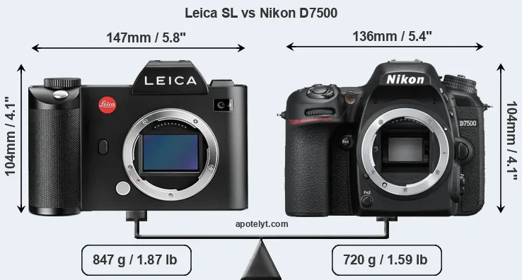 Die Leica SL (Typ 601) und die Nikon D7500 sind zwei digitale Kameras, die im Oktober 2015 beziehungsweise im April 2017 vorgestellt wurden. Die Leica SL is eine eine spiegellose Wechselobjektivkamera, während es sich bei der D7500 um eine digitale Spiegelreflexkamera handelt. Die Kameras sind mit einem Vollformatsensor (Leica SL) und einem APS-C Sensor (D7500) ausgerüstet. Die Leica hat eine Auflösung von 24,0 Megapixel, während die Nikon 20,7 MP bietet.