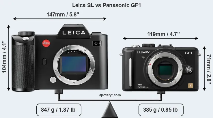 Die Leica SL (Typ 601) und die Panasonic Lumix DMC-GF1 sind zwei digitale Kameras, die im Oktober 2015 beziehungsweise im September 2009 vorgestellt wurden. Bei beiden Modellen handelt es sich um spiegellose Wechselobjektivkameras, die mit einem Vollformatsensor (Leica SL) und einem Four Thirds sensor (GF1) ausgerüstet sind. Die Leica hat eine Auflösung von 24,0 Megapixel, während die Panasonic 12,0 MP bietet.