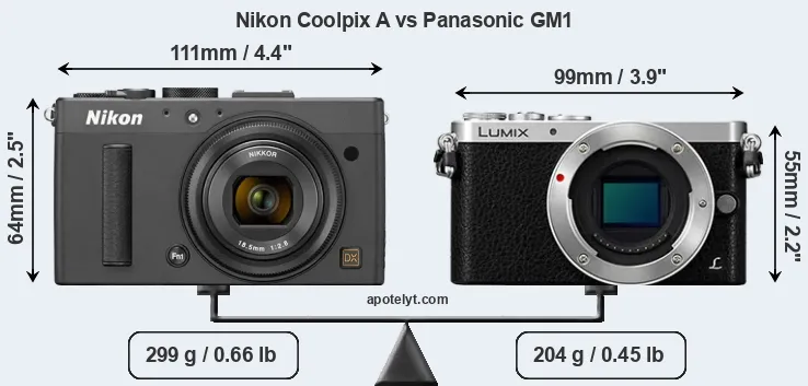 Die physische Größe und das Gewicht der Nikon Coolpix A und der Panasonic GM1 werden in der nachfolgenden Graphik illustriert. Die beiden Kameras werden entsprechend ihrer relativen Größe dargestellt. Alle Größenangaben sind auf den nächsten Millimeter gerundet.