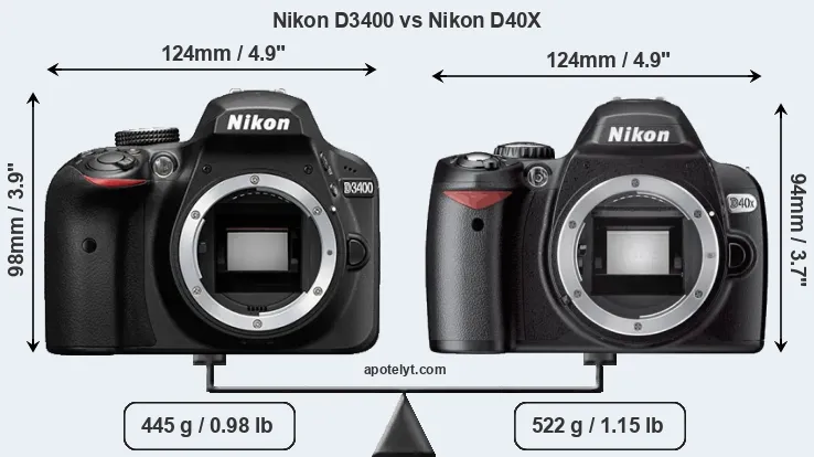 Die physische Größe und das Gewicht der Nikon D3400 und der Nikon D40X werden in der nachfolgenden Graphik illustriert. Die beiden Kameras werden entsprechend ihrer relativen Größe dargestellt. Alle Größenangaben sind auf den nächsten Millimeter gerundet.