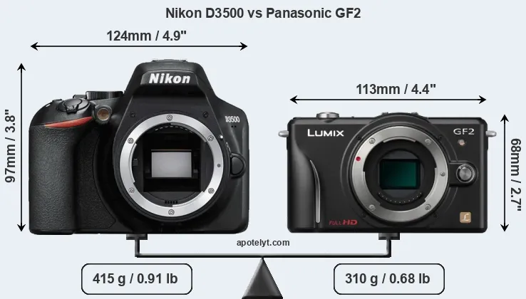 Die physische Größe und das Gewicht der Nikon D3500 und der Panasonic GF2 werden in der nachfolgenden Graphik illustriert. Die beiden Kameras werden entsprechend ihrer relativen Größe dargestellt. Alle Größenangaben sind auf den nächsten Millimeter gerundet.