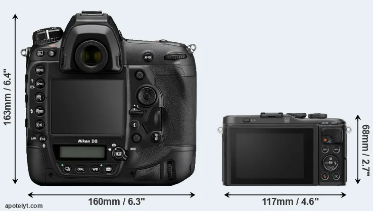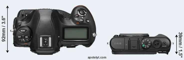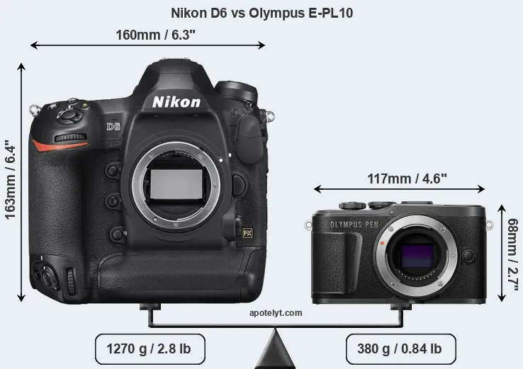 Die physische Größe und das Gewicht der Nikon D6 und der Olympus E-PL10 werden in der nachfolgenden Graphik illustriert. Die beiden Kameras werden entsprechend ihrer relativen Größe dargestellt. Alle Größenangaben sind auf den nächsten Millimeter gerundet.