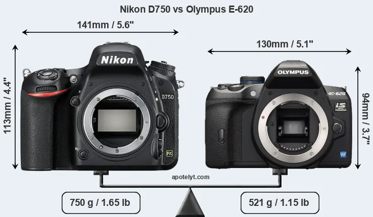 Die physische Größe und das Gewicht der Nikon D750 und der Olympus E-620 werden in der nachfolgenden Graphik illustriert. Die beiden Kameras werden entsprechend ihrer relativen Größe dargestellt. Alle Größenangaben sind auf den nächsten Millimeter gerundet.