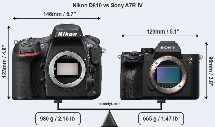 Die physische Größe und das Gewicht der Nikon D810 und der Sony A7R IV werden in der nachfolgenden Graphik illustriert. Die beiden Kameras werden entsprechend ihrer relativen Größe dargestellt. Alle Größenangaben sind auf den nächsten Millimeter gerundet.