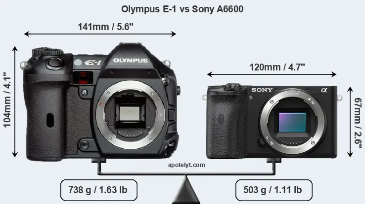 Die physische Größe und das Gewicht der Olympus E-1 und der Sony A6600 werden in der nachfolgenden Graphik illustriert. Die beiden Kameras werden entsprechend ihrer relativen Größe dargestellt. Alle Größenangaben sind auf den nächsten Millimeter gerundet.