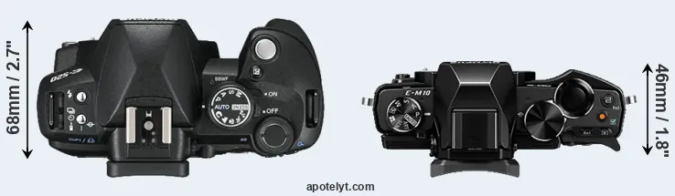 Die physische Größe und das Gewicht der Olympus E-520 und der Olympus E-M10 werden in der nachfolgenden Graphik illustriert. Die beiden Kameras werden entsprechend ihrer relativen Größe dargestellt. Alle Größenangaben sind auf den nächsten Millimeter gerundet.