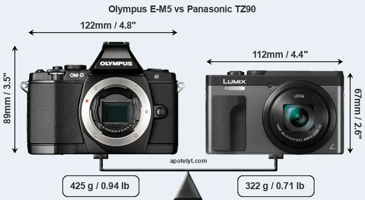 Die physische Größe und das Gewicht der Olympus E-M5 und der Panasonic TZ90 werden in der nachfolgenden Graphik illustriert. Die beiden Kameras werden entsprechend ihrer relativen Größe dargestellt. Alle Größenangaben sind auf den nächsten Millimeter gerundet.