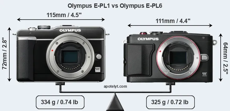 Die physische Größe und das Gewicht der Olympus E-PL1 und der Olympus E-PL6 werden in der nachfolgenden Graphik illustriert. Die beiden Kameras werden entsprechend ihrer relativen Größe dargestellt. Alle Größenangaben sind auf den nächsten Millimeter gerundet.