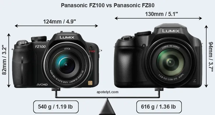 Die physische Größe und das Gewicht der Panasonic FZ100 und der Panasonic FZ80 werden in der nachfolgenden Graphik illustriert. Die beiden Kameras werden entsprechend ihrer relativen Größe dargestellt. Alle Größenangaben sind auf den nächsten Millimeter gerundet.