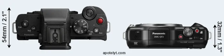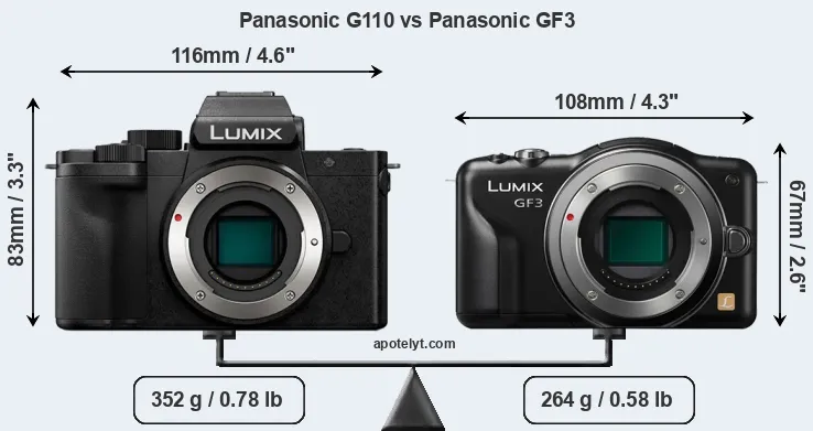 Die physische Größe und das Gewicht der Panasonic G110 und der Panasonic GF3 werden in der nachfolgenden Graphik illustriert. Die beiden Kameras werden entsprechend ihrer relativen Größe dargestellt. Alle Größenangaben sind auf den nächsten Millimeter gerundet.