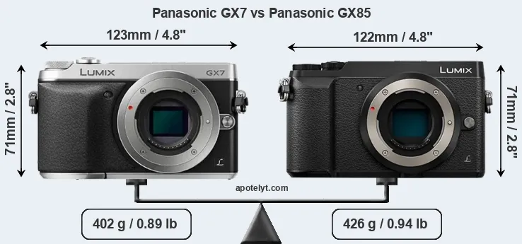 Die physische Größe und das Gewicht der Panasonic GX7 und der Panasonic GX85 werden in der nachfolgenden Graphik illustriert. Die beiden Kameras werden entsprechend ihrer relativen Größe dargestellt. Alle Größenangaben sind auf den nächsten Millimeter gerundet.