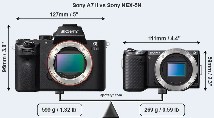Die physische Größe und das Gewicht der Sony A7 II und der Sony NEX-5N werden in der nachfolgenden Graphik illustriert. Die beiden Kameras werden entsprechend ihrer relativen Größe dargestellt. Alle Größenangaben sind auf den nächsten Millimeter gerundet.