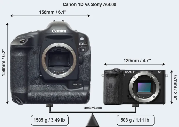 El tamaño físico y el peso de Canon 1D y Sony A6600 se ilustran en el siguiente gráfico. Las dos cámaras se muestran según su tamaño relativo. Todas las dimensiones están redondeadas al milímetro más cercano.