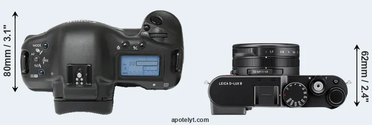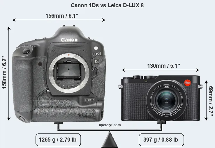 El tamaño físico y el peso de Canon 1Ds y Leica D-LUX 8 se ilustran en el siguiente gráfico. Las dos cámaras se muestran según su tamaño relativo. Todas las dimensiones están redondeadas al milímetro más cercano.