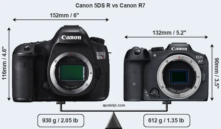 La Canon EOS 5DS R y la Canon EOS R7 son dos cámaras digitales que fueron reveladas al público, respectivamente, en febrero de 2015 y mayo de 2022. La 5DS R es una cámara DSLR, mientras que la R7 es una cámara de objectivos intercambiables sin espejo.Las cámaras son equipados con un sensor de fotograma completo (5DS R) y un sensor de fotograma APS-C (R7). La 5DS R tiene una resolución de 50,3 megapíxeles, mientras que la R7 proporciona 32,3 MP.