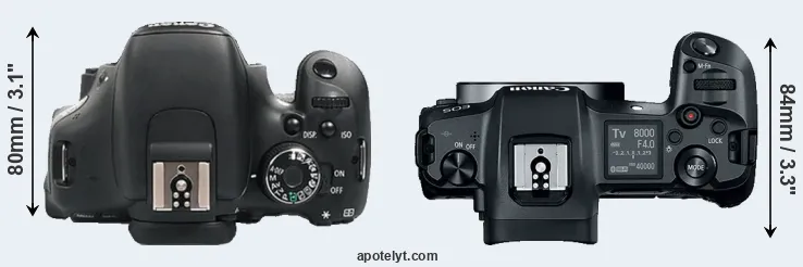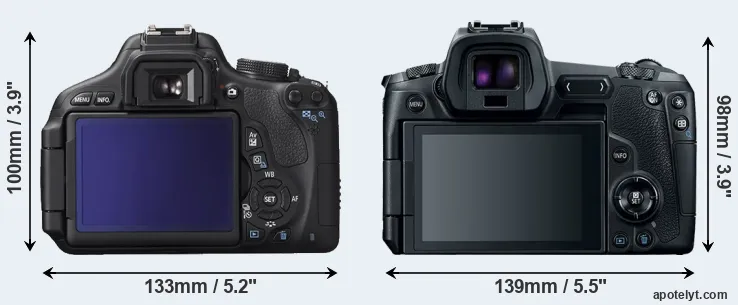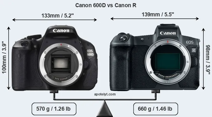 El tamaño físico y el peso de Canon 600D y Canon R se ilustran en el siguiente gráfico. Las dos cámaras se muestran según su tamaño relativo. Todas las dimensiones están redondeadas al milímetro más cercano.