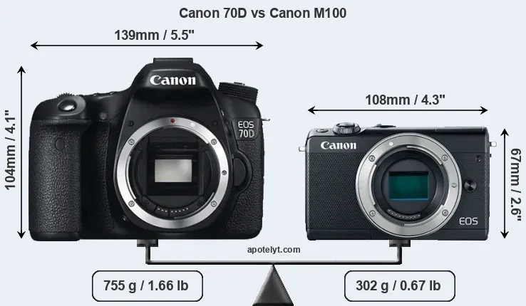 El tamaño físico y el peso de Canon 70D y Canon M100 se ilustran en el siguiente gráfico. Las dos cámaras se muestran según su tamaño relativo. Todas las dimensiones están redondeadas al milímetro más cercano.