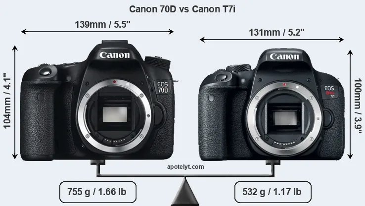 El tamaño físico y el peso de Canon 70D y Canon T7i se ilustran en el siguiente gráfico. Las dos cámaras se muestran según su tamaño relativo. Todas las dimensiones están redondeadas al milímetro más cercano.
