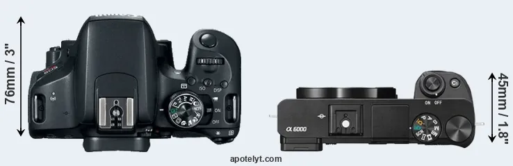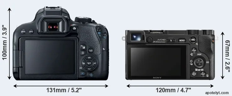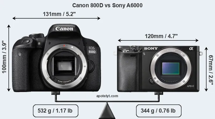 El tamaño físico y el peso de Canon 800D y Sony A6000 se ilustran en el siguiente gráfico. Las dos cámaras se muestran según su tamaño relativo. Todas las dimensiones están redondeadas al milímetro más cercano.