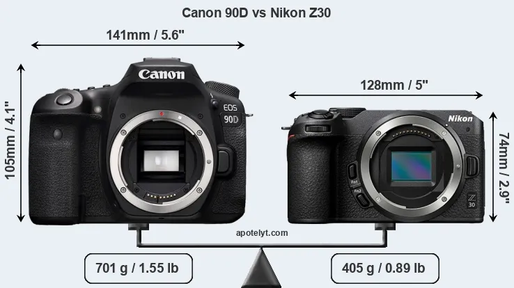 La Canon EOS 90D y la Nikon Z30 son dos cámaras digitales que fueron reveladas al público, respectivamente, en agosto de 2019 y junio de 2022. La 90D es una cámara DSLR, mientras que la Z30 es una cámara de objectivos intercambiables sin espejo.Ambas cámaras están equipados con un sensor de fotograma APS-C. La Canon tiene una resolución de 32,3 megapíxeles, mientras que la Nikon proporciona 20,7 MP.