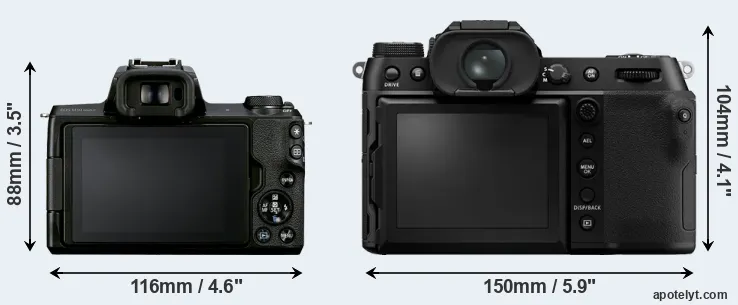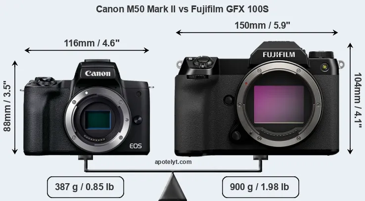 La Canon EOS M50 Mark II y la Fujifilm GFX 100S son dos cámaras digitales que fueron reveladas al público, respectivamente, en octubre de 2020 y enero de 2021. Ambas son cámaras cámara de objectivos intercambiables sin espejo, que están equipados con un sensor de fotograma APS-C (M50 Mark II) y un sensor de formato medio (GFX 100S). La Canon tiene una resolución de 24,0 megapíxeles, mientras que la Fujifilm proporciona 101,8 MP.