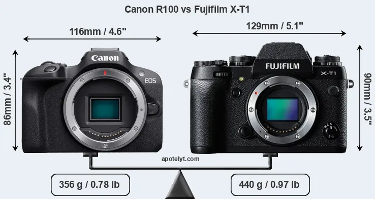 El tamaño físico y el peso de Canon R100 y Fujifilm X-T1 se ilustran en el siguiente gráfico. Las dos cámaras se muestran según su tamaño relativo. Todas las dimensiones están redondeadas al milímetro más cercano.