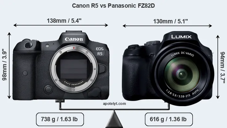 El tamaño físico y el peso de Canon R5 y Panasonic FZ82D se ilustran en el siguiente gráfico. Las dos cámaras se muestran según su tamaño relativo. Todas las dimensiones están redondeadas al milímetro más cercano.
