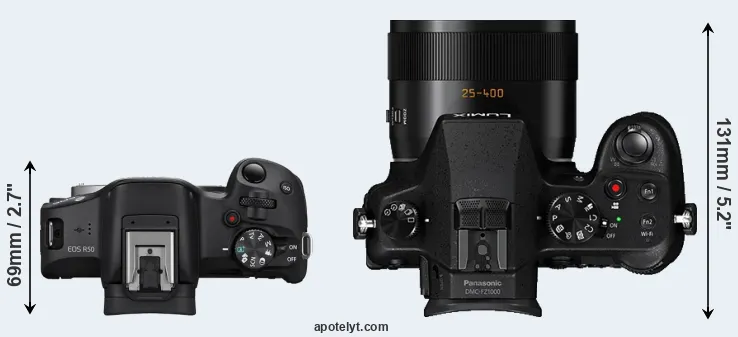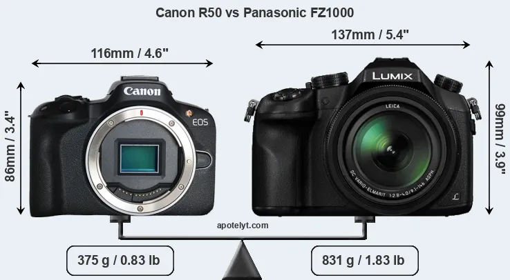 El tamaño físico y el peso de Canon R50 y Panasonic FZ1000 se ilustran en el siguiente gráfico. Las dos cámaras se muestran según su tamaño relativo. Todas las dimensiones están redondeadas al milímetro más cercano.
