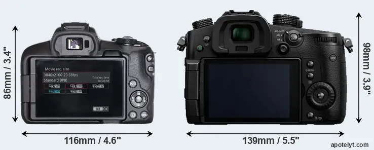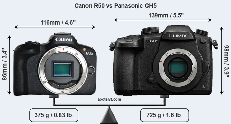 El tamaño físico y el peso de Canon R50 y Panasonic GH5 se ilustran en el siguiente gráfico. Las dos cámaras se muestran según su tamaño relativo. Todas las dimensiones están redondeadas al milímetro más cercano.