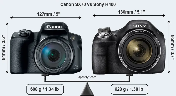 El tamaño físico y el peso de Canon SX70 y Sony H400 se ilustran en el siguiente gráfico. Las dos cámaras se muestran según su tamaño relativo. Todas las dimensiones están redondeadas al milímetro más cercano.