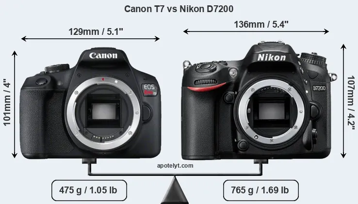 El tamaño físico y el peso de Canon T7 y Nikon D7200 se ilustran en el siguiente gráfico. Las dos cámaras se muestran según su tamaño relativo. Todas las dimensiones están redondeadas al milímetro más cercano.