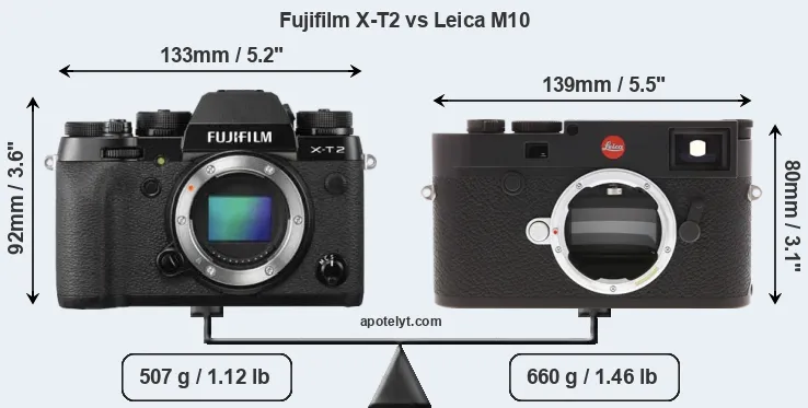 La Fujifilm X-T2 y la Leica M10 (Typ 3656) son dos cámaras digitales que fueron reveladas al público, respectivamente, en julio de 2016 y enero de 2017. La X-T2 es una cámara de objectivos intercambiables sin espejo, mientras que la M10 es una cámara sin espejo con enfoque de telémetro. Las cámaras son equipados con un sensor de fotograma APS-C (X-T2) y un sensor de fotograma completo (M10). La Fujifilm tiene una resolución de 24,0 megapíxeles, mientras que la Leica proporciona 23,8 MP.