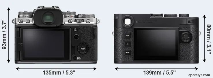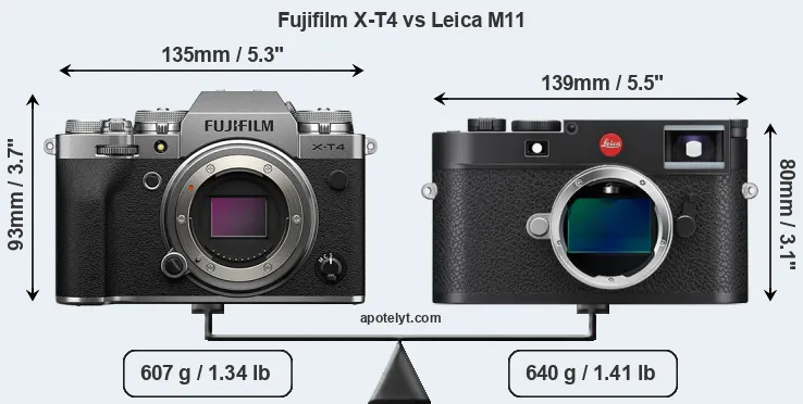 La Fujifilm X-T4 y la Leica M11 (Typ 2416) son dos cámaras digitales que fueron reveladas al público, respectivamente, en febrero de 2020 y enero de 2022. La X-T4 es una cámara de objectivos intercambiables sin espejo, mientras que la M11 es una cámara sin espejo con enfoque de telémetro. Las cámaras son equipados con un sensor de fotograma APS-C (X-T4) y un sensor de fotograma completo (M11). La Fujifilm tiene una resolución de 26,0 megapíxeles, mientras que la Leica proporciona 60,3 MP.
