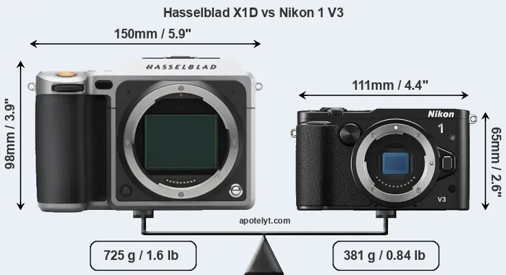 El tamaño físico y el peso de Hasselblad X1D y Nikon 1 V3 se ilustran en el siguiente gráfico. Las dos cámaras se muestran según su tamaño relativo. Todas las dimensiones están redondeadas al milímetro más cercano.