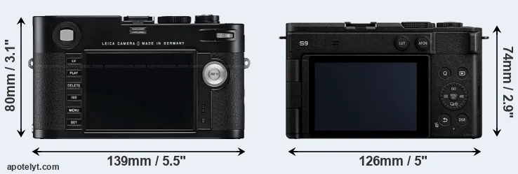 El tamaño físico y el peso de Leica M Typ 240 y Panasonic S9 se ilustran en el siguiente gráfico. Las dos cámaras se muestran según su tamaño relativo. Todas las dimensiones están redondeadas al milímetro más cercano.