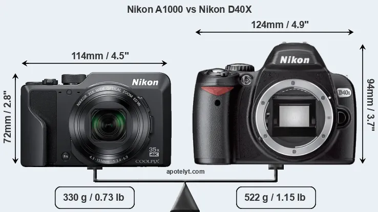 El tamaño físico y el peso de Nikon A1000 y Nikon D40X se ilustran en el siguiente gráfico. Las dos cámaras se muestran según su tamaño relativo. Todas las dimensiones están redondeadas al milímetro más cercano.