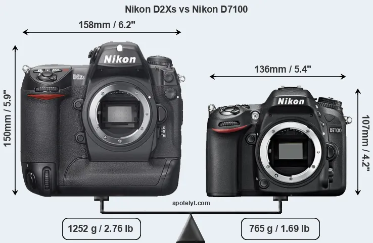 El tamaño físico y el peso de Nikon D2Xs y Nikon D7100 se ilustran en el siguiente gráfico. Las dos cámaras se muestran según su tamaño relativo. Todas las dimensiones están redondeadas al milímetro más cercano.