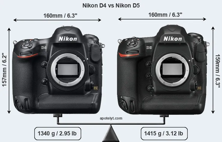 El tamaño físico y el peso de Nikon D4 y Nikon D5 se ilustran en el siguiente gráfico. Las dos cámaras se muestran según su tamaño relativo. Todas las dimensiones están redondeadas al milímetro más cercano.