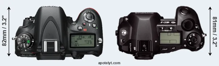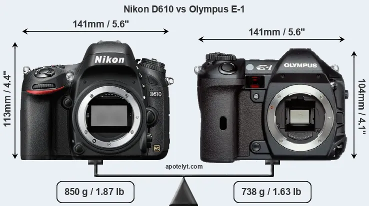 El tamaño físico y el peso de Nikon D610 y Olympus E-1 se ilustran en el siguiente gráfico. Las dos cámaras se muestran según su tamaño relativo. Todas las dimensiones están redondeadas al milímetro más cercano.