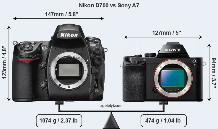 La Nikon D700 y la Sony Alpha A7 son dos cámaras digitales que fueron reveladas al público, respectivamente, en julio de 2008 y octubre de 2013. La D700 es una cámara DSLR, mientras que la A7 es una cámara de objectivos intercambiables sin espejo.Ambas cámaras están equipados con un sensor de fotograma completo. La Nikon tiene una resolución de 12,1 megapíxeles, mientras que la Sony proporciona 24,0 MP.