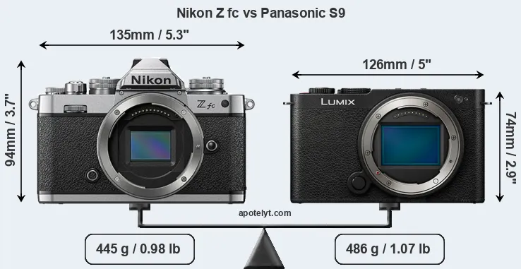 La Nikon Z fc y la Panasonic Lumix DC-S9 son dos cámaras digitales que fueron reveladas al público, respectivamente, en junio de 2021 y mayo de 2024. Ambas son cámaras cámara de objectivos intercambiables sin espejo, que están equipados con un sensor de fotograma APS-C (Z fc) y un sensor de fotograma completo (S9). La Nikon tiene una resolución de 20,7 megapíxeles, mientras que la Panasonic proporciona 24,0 MP.