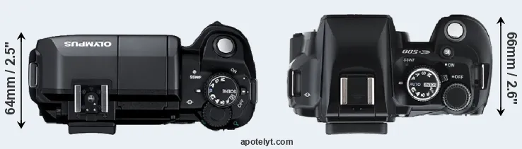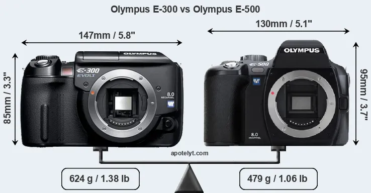 El tamaño físico y el peso de Olympus E-300 y Olympus E-500 se ilustran en el siguiente gráfico. Las dos cámaras se muestran según su tamaño relativo. Todas las dimensiones están redondeadas al milímetro más cercano.