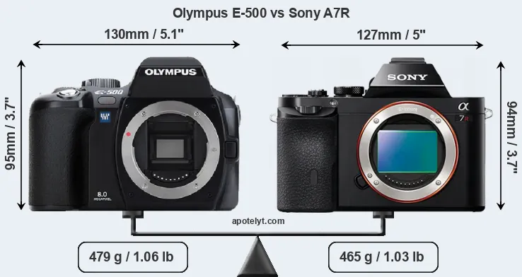 La Olympus Evolt E-500 y la Sony Alpha A7R son dos cámaras digitales que fueron reveladas al público, respectivamente, en septiembre de 2005 y octubre de 2013. La E-500 es una cámara DSLR, mientras que la A7R es una cámara de objectivos intercambiables sin espejo.Las cámaras son equipados con un sensor de cuatro tercios (E-500) y un sensor de fotograma completo (A7R). La Olympus tiene una resolución de 8,0 megapíxeles, mientras que la Sony proporciona 36,2 MP.