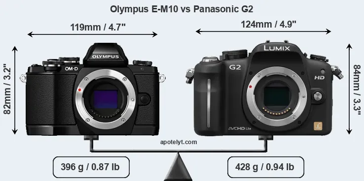 El tamaño físico y el peso de Olympus E-M10 y Panasonic G2 se ilustran en el siguiente gráfico. Las dos cámaras se muestran según su tamaño relativo. Todas las dimensiones están redondeadas al milímetro más cercano.