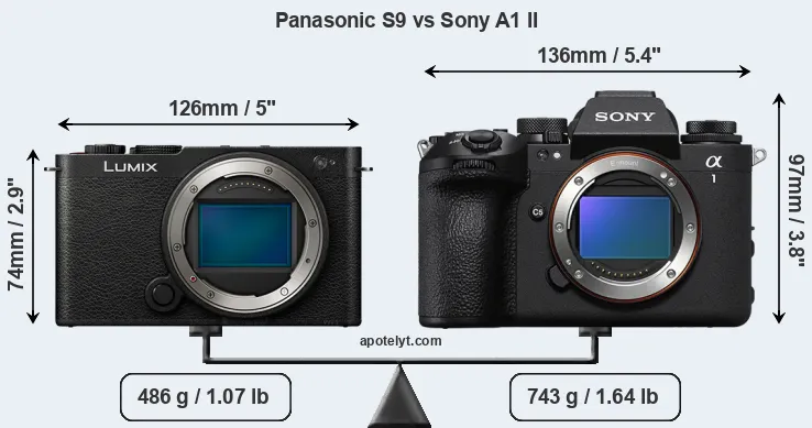 El tamaño físico y el peso de Panasonic S9 y Sony A1 II se ilustran en el siguiente gráfico. Las dos cámaras se muestran según su tamaño relativo. Todas las dimensiones están redondeadas al milímetro más cercano.