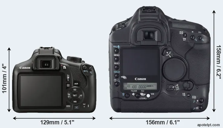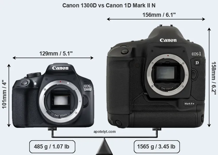 La taille physique et le poids du Canon 1300D et du Canon 1D Mark II N sont illustrés dans le graphique ci-dessous. Les deux caméras sont affichées en fonction de leur taille relative. Toutes les dimensions sont arrondies au millimètre près.