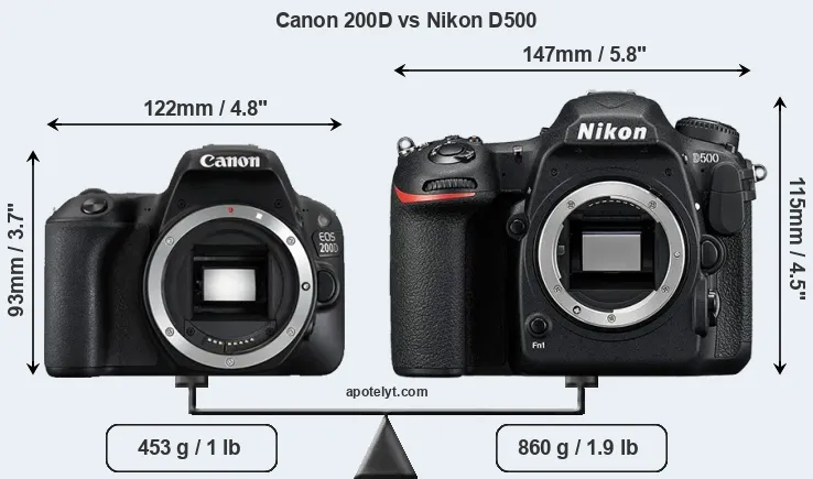 Le Canon EOS 200D et le Nikon D500 sont deux appareils photo numériques, qui ont été révélés au public, respectivement, en June 2017 et January 2016. Les deux sont des appareils photo reflex numériques (Digital Single Lens Reflex) qui sont équipés d'un capteur APS-C. Le Canon a une résolution de 24,0 mégapixels, alors que le Nikon fournit 20,7 MP.