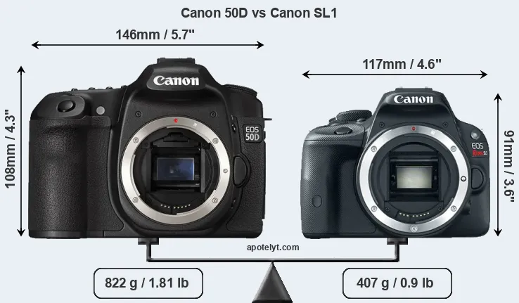 La taille physique et le poids du Canon 50D et du Canon SL1 sont illustrés dans le graphique ci-dessous. Les deux caméras sont affichées en fonction de leur taille relative. Toutes les dimensions sont arrondies au millimètre près.