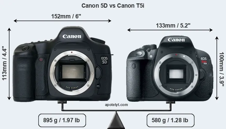Le Canon EOS 5D et le Canon EOS Rebel T5i sont deux appareils photo numériques, qui ont été révélés au public, respectivement, en August 2005 et March 2013. Les deux sont des appareils photo reflex numériques (Digital Single Lens Reflex) qui sont équipés d'un capteur plein format (5D) et un capteur APS-C (T5i). Le 5D a une résolution de 12,7 mégapixels, alors que le T5i fournit 17,9 MP.